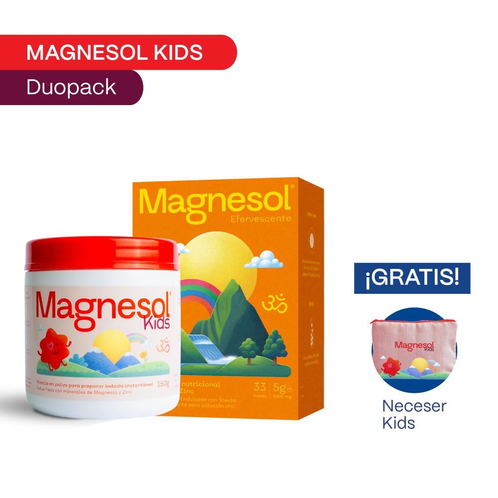 Magnesol es un Suplemento Nutricional en base a Magnesio y Zinc elaborado bajo altos estándares de calidad. Beneficios del Magnesio: Ayuda a Equilibrar el Sistema Nervioso, Contribuye a dar Vitalidad y Energía, y es un Aliado para la prevención de tu salud. Precauciones y Advertencias: El uso en embarazo y Lactancia deberá ser bajo el control de su médico tratante.Magnesol kids es una mezcla en polvo para consumo como bebida instantánea, con sabor a fresa que proporciona magnesio y zinc para el crecimimiento y desarrollo de los niños.Precauciones y Advertencias: Es importante consultar con un médico antes de tomar MAGNESOL KIDS si el niño tiene alguna condición médica. No recomendado en pacientes con insuficiencia renal.
